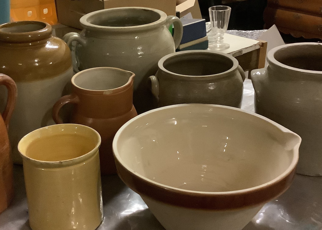 In de brocantehoeken hebben we een wisselend aanbod uit binnen- en buitenland met een grote voorliefde voor Frankrijk. Denk aan grespotten, stoere bakken, lieve vaasjes, gebloemd serviesgoed, oude borden en kommen, emaille, tin, zink, rieten manden enzovoorts. Vazen in alle soorten en maten spelen een hoofdrol.